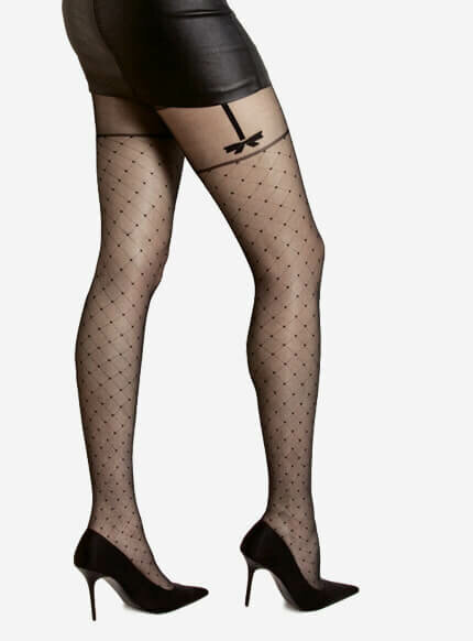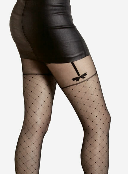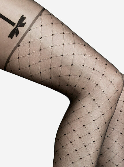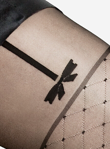 PIACERE to rajstopy o grubości 20 den z niezwykle oryginalnym wzorem inspirowanym klasycznymi kabaretkami. Ich górna część została zwieńczona printem nawiązującym do zmysłowej podwiązki ze wstążeczką. Czy może być bardziej kobieco?